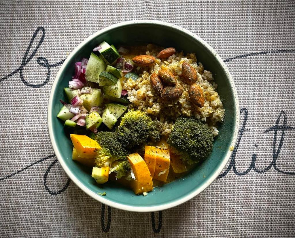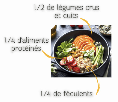 - La moitié de légumes crus et cuits avec des fruits en compléments (ces derniers ne sont pas obligatoires)