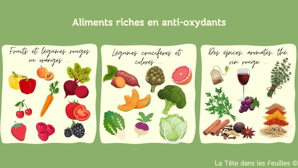 Parmi les anti-oxydants, on trouve notamment les caroténoïdes, les polyphénols, les terpènes, la vitamine C, la vitamine E, le sélénium, le zinc, la chlorophylle.