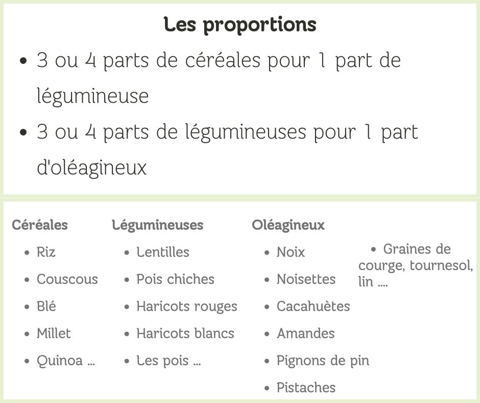 Un tableau très pratique pour avoir la bonne proportion entre légumineuses, céréales et oléagineux dans son assiette afin d’avoir tous les acides aminés (AA) dans notre assiette. Les AA sont des constituants essentiels pour les protéines de notre corps. Ces proportions sont notamment très importantes à respecter pour les personnes suivant un régime végétarien pour éviter les carences.